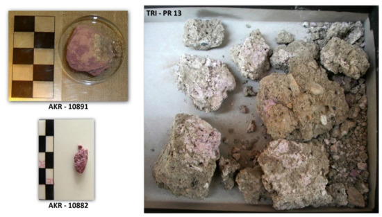 Photographs of the three purple pigment finds AKR-10891, AKR-10882, and TRI-PR13. (The photograph of pigment inv. no 10891 is of the part exhibited in the Museum of Prehistoric Thera, Thera, Greece).
