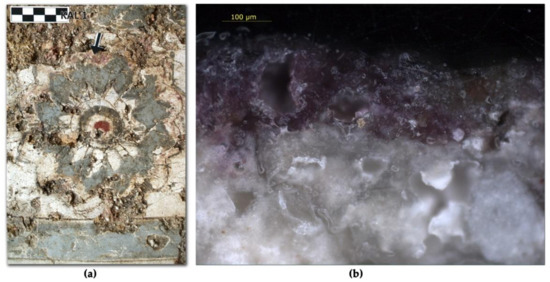 (a) Photograph of the wall-painting detail from Raos, with an indication of the sampling site on the purple petal of the rosette and (b) microphotograph of the cross-section of sample RAOS-KAL1.