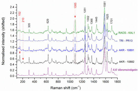 MicroRaman spectra acquired on samples from the purple pigment finds from Akrotiri and Trianda, (AKR-10882, AKR-10891, and TRI-PR13), as well as from the purple paint detail on the wall painting from Raos (RAOS-KAL1). The spectral signature of 6,6′-DBI is displayed in all the spectra acquired on the archaeological samples, shown in comparison with the spectrum taken on a synthetic 6,6′-DBI substance, [43].
