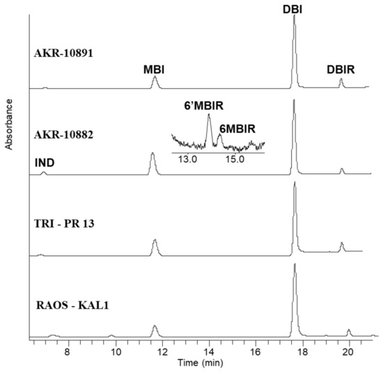 Chromatograms that were collected at 288 nm for the archaeological samples. The major HPLC peaks correspond to MBI, DBI and DBIR. Much smaller peaks were recorded for IND, 6’MBIR and 6MBIR as revealed for instance in the chromatogram of sample AKR-10882, shown in higher detail. The graphs for the samples AKR-10891 and AKR-10882 were adapted from [30] (with permission from Elsevier) and [32], respectively.