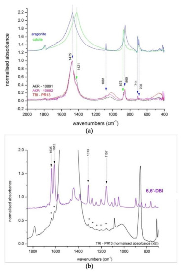 Complementary data were collected with the corresponding FTIR spectra acquired from a few particles of each of the investigated samples. It should be mentioned that the FTIR spectra refer to a higher amount of sample, and thus are more representative of the bulk pigment than the Raman spectra acquired on single particles focused under the 100× objective of the Raman microscope, which allows a spatial resolution close to 1 µm. In the FTIR spectra shown in Figure 5a, it is possible to identify with certainty both aragonite and calcite in the inorganic substrate of the pigment based on the bands that are specific to one of the calcium carbonate polymorphs. In the case of the samples taken from wall-painting details, calcite may have derived also from the lime-based ground or may refer to chalk white as a pigment in the painting. However, the identification of both calcium carbonate allotropes and aragonite in particular in the purple pigment found in lump form puts in evidence the marine origin of the calcium carbonate substrate of the organic pigment. In the FTIR spectra, the well-resolved bands at 1475, 1081, 860, 711, and 700 cm−1 perfectly reproduce the respective characteristic bands of pure aragonite. Among the IR absorption bands of the carbonate ion, the split peaks at 711 and 700 cm−1 (ν4 mode) and the peak at 1081 cm−1 (ν1 mode) are specific to the aragonite structure whereas the peak assigned to the ν2 mode appears with a difference of ~15 cm−1 for the two polymorphs, namely, at 860 cm−1 for aragonite versus 875 cm−1 for calcite [57,58]. Additionally, the stronger and broad absorption band assigned to the ν3 mode, presenting a significant shift for calcite (at 1421 cm−1) compared to aragonite (at 1475 cm−1), further confirmed the presence of both calcium carbonate polymorphs in the composition of the purple pigments. For the identification of the DBI compound, only the two main bands at 1635 and 1612 cm−1 were barely resolved on the slope of the main broad carbonate band, Figure 5b, [26,43,45].