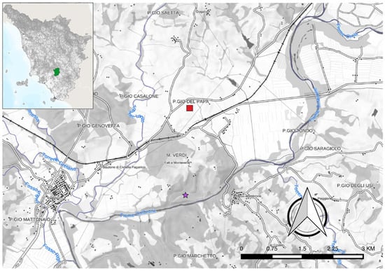 Map showing the area of the IMPERO Project. The red square indicates the location of Podere Cannicci, the late Etruscan and Republican sanctuary and vicus; the purple star indicates the location of the deserted medieval village of Castellaraccio di Monteverdi.
