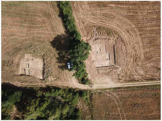 The IMPERO Project also investigates a medieval site. As one of the tasks of the research is to understand the changes that occurred between the classical and the modern world along the valley of the Ombrone river, it was necessary to excavate the remains of Castellaraccio di Monteverdi, a fortified hilltop settlement facing the river and a collapsed medieval bridge that crossed it [,,] (Figure 8).