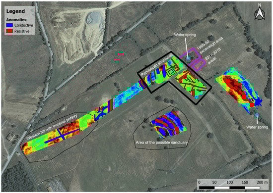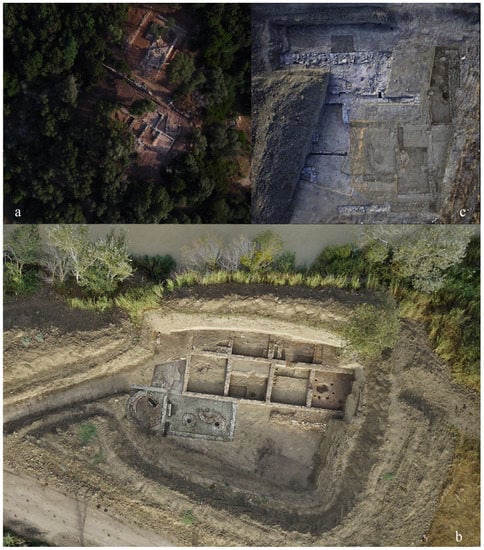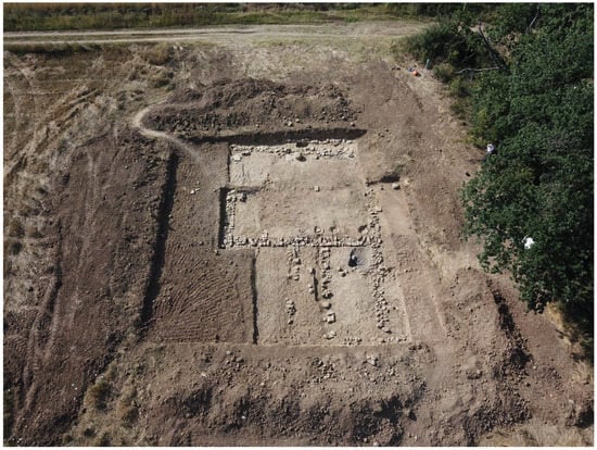 Located at the feet of gentle slopes of a Tuscan hill, Podere Cannicci represents quite an intriguing Etruscan to late Republican site (5th century BCE—early 1st century BCE) (Figure 3). Its story begins with a natural sacred place, attested by the abundance of votive offerings recovered in the 1980s during some rescue excavations carried out by the Soprintendenza Archeologica della Toscana [,], and continues with the construction of a possible vicus, the economic strategy of which relied heavily on its strategic location along riverine and terrestrial trade routes [,]. The village grew economically and, most likely, socially to the point of becoming a reference point within the surrounding territory. The excavations and geophysical surveys have clearly shown that the settlement extended on a wide area of at least 4 ha, with a number of different complexes (Figure 4), including dwellings for the villagers, as well as manufacturing structures and storage facilities, all of which point to a thriving and flourishing settlement. Apparently, its fortune was also determined by proximity to the religious area. Although monumental or substantial remains are not yet visible (if any were ever constructed!), the votive sphere at Cannicci clearly revolved around fertility cults and offerings [,]. Terracotta uteri were predominant in the ancient votive deposits and were accompanied by small terracotta heads and statuettes (Figure 5). The settlement relied on agrarian economy, and also on craftsmanship. The proximity to the sanctuary also meant that the inhabitants could produce some of the necessary offerings and special requests of the sacred place: black gloss ware and ex-votos, both in metal and pottery, were produced here in specialized and seasonal workshops. The excavations brought back to light the heavy background noise of these activities. A large amount of waste testifies to the intense production of metal objects, domestic ware and luxury black gloss ware vessels (Figure 6). As the excavations grew bigger in 2019, another dwelling of the village was investigated; the remains of a large facility appeared, with one room containing at least 7 dolia (Figure 7) [].
