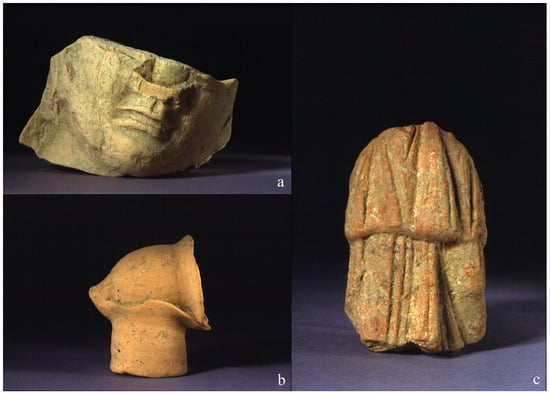 Some of the votive offerings collected during the 1989–1990 excavations at Podere Cannicci; (a) represents a terracotta face; (b) represents one uterus; (c) is a clay statuette, maybe representing Minerva.