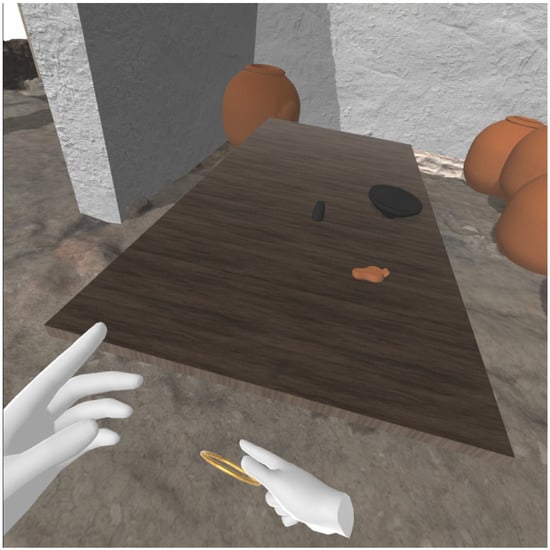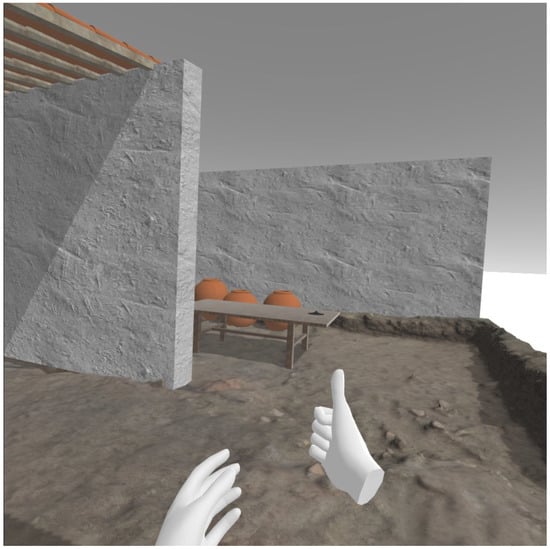 Our Oculus Quest experiment—In this case the user can navigate inside the virtually reconstructed Roman buildings at Podere Cannicci. Here the user interacts with objects found on the remains of a carbonized Roman table.