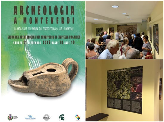 The exhibition was divided into a series of rooms with panels where the various stories related to the excavations at Podere Cannicci and Castellaraccio di Monteverdi were explained (Figure 21). Moreover, through the use of QR codes, visitors were able to visualize artifacts that could not be displayed, learn their stories, and assimilate and appropriate their historical identities. Technology also allowed us to disseminate our preliminary results through the establishment of a web-based virtual exhibit. People from all over the world can still visualize our work, debate our theories and study our artifacts (www.imperoproject.com/archeologia-a-monteverdi). Our intention is to renovate the exhibition every year, showing different aspects of our research, as well as of the historical landscapes of the municipality of Civitella Paganico.
