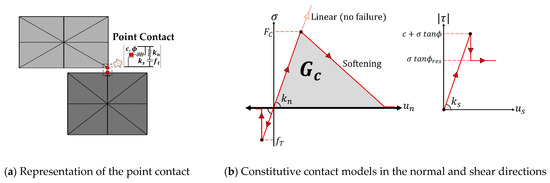 Crack localization is a salient feature of masonry construction; it mostly develops at the mortar joints, especially for the strong-unit–weak-bond assemblies [29]. The discrete element modeling framework provides an advantage compared to standard continuum-based computational techniques, where the contact openings, sliding, and total contact detachments are simulated along the boundaries of the generated discontinuum system automatically. First, the adjacent blocks are recognized, and then sub-contacts are defined for each contact point, as illustrated in Figure 2a. In 3DEC, the common plane (c-p) concept is utilized to detect the neighboring blocks and update the contact conditions during the analysis. The c-p approach includes two parts: (i) defining a unique plane cutting across the space between two adjacent blocks; (ii) testing each block individually for a contact using the common plane, which is ultimately defined by solving an optimization problem by minimizing the maximum overlap with either block [30]. Note that the implemented c-p algorithm is based on geometry and is applied in parallel with the mechanical calculations [28]. At the end of the contact detection procedure, the contact type, the unit normal vector of the c-p, and the gap or overlap between the blocks in contact are provided. The point-contact types can be vertex-to-face (V.F.) or edge-to-edge (E.E.). Once the contact points are identified, normal and shear springs are assigned in the orthogonal directions (Figure 2a). Accordingly, at each step, elastic stress increments (normal and shear stresses) are calculated for the active contact points based on the relative displacements among the adjacent blocks and are added to old ones to obtain the new contact stresses, as written in Equation (6). Thus, the inter-block action/reaction forces are calculated as a function of relative block displacements at each contact point and are then updated depending on the defined contact stress-displacement law [31].