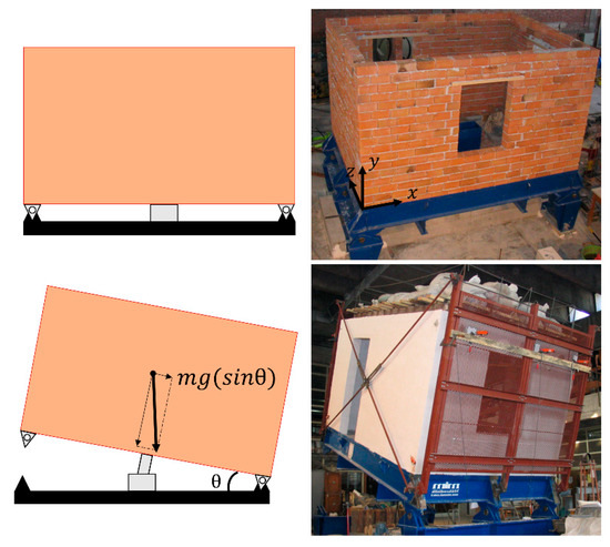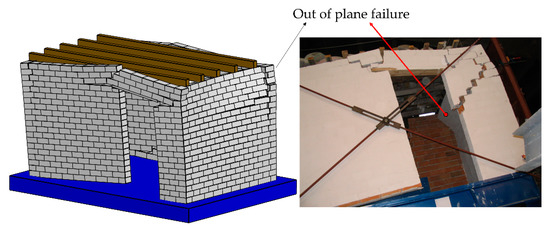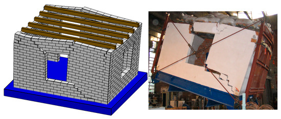 In this section, the employed modeling approach is validated by comparing the analytical results to experimental findings in terms of the collapse mechanism and acceleration vs. displacement response. The validation study comprised a full-scale (1/1) unreinforced single-story masonry house that was tested using a tilting test setup. A tilting test (or tilting table test) provides a first-order seismic assessment, where the mass-proportional forces are indirectly applied by rotating the base platform in a quasi-static fashion. Although a tilting test does not predict a structure’s dynamic behavior, it is still a widely used alternative method, as it provides valuable information about the possible collapse mechanisms and lower-bound seismic capacities for unreinforced masonry constructions, as discussed in [38].