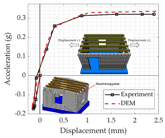 In the experiment, a pseudo-cyclic loading was applied to the structure by first tilting the base platform in the negative x-direction and then in the positive x-direction until the total collapse. The out-of-plane deflection of the walls was measured via displacement transducers (LVDTs). The same loading pattern and monitoring point (see Figure 4) were considered in the discrete element model. Figure 4 shows that the acceleration versus displacement response obtained from the computational model was in line with the experimental one, with a maximum acceleration difference of approximately 3%.