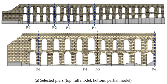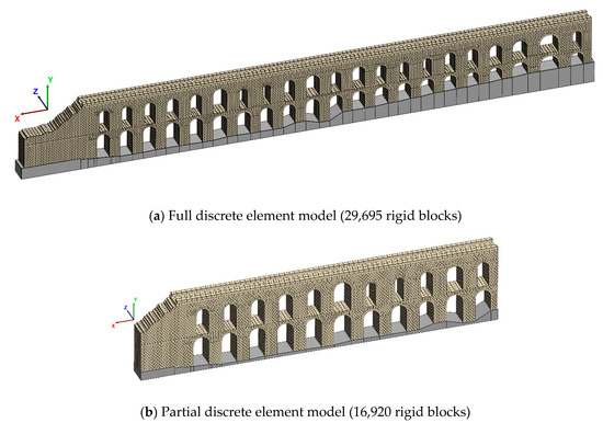 First, the full model, consisting of 29,695 rigid blocks and representing a 195 m long section, was analyzed, as shown in Figure 6a. The full model was intended to approximately represent the whole central part of the aqueduct. However, it was a very detailed depiction of the Valens Aqueduct, and the computational cost was unfeasible. Therefore, a partial model was also generated by considering a part of the full model that showed the highest displacement response and captured the damage pattern observed in the pushover analysis. The partial model, shown in Figure 6b, was made up of 16,920 rigid blocks, and it was 102 m long, yielding more computational-cost-effective results. In both cases, the average block height-to-length ratio was determined to be 0.5.