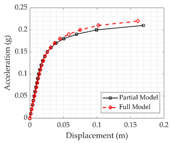 A two-step loading protocol was followed during the pushover analysis. Initially, the computational models were brought into a state of equilibrium under the gravity loads. Then, both models (full and partial) were subjected to forces (i.e., towards the out-of-plane direction of the aqueducts, denoted as the z-axis in Figure 6) proportional to the mass by exerting lateral acceleration with 0.01 g increments. The results of the pushover analyses were compared in terms of deformation and the corresponding damage patterns. The displacements were monitored from the most deflected block at the upper edge of the structure during the analysis. No discrepancies between the pushover curves in the elastic regime were noted, as shown in Figure 7. The difference between the two curves became noticeable towards the failure, but remained less than 5%, and 0.22 and 0.21 g seismic capacities were obtained for the full and partial models, respectively. Thus, the results indicate a similar acceleration versus displacement behavior between the two models.