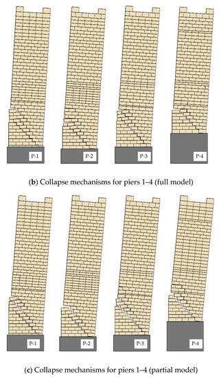 To compare the damage patterns and better visualize the failure mechanism at the piers, four of the severely damaged ones were selected from the analysis, as demonstrated in Figure 8a. All four piers (captured from the partial and full models) indicated an over-turning collapse mechanism. The joint openings occurred due to higher flexural tensile stresses at the contact points and were followed by the progression of the crack towards the opposite bottom corner (or toe) of the pier, revealing a distinctive diagonal crack (see Figure 8b,c). This failure mechanism was influenced by the joint tensile strength and the morphology of the wall cross-section, as discussed in [36,47]. Since a low tensile strength (i.e., 0.25 MPa) was considered at the joints, the piers demonstrated non-monolithic behavior that could cause successive joint openings, leading to single or multiple diagonal cracks, as can be seen in Figure 8a,b.