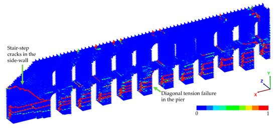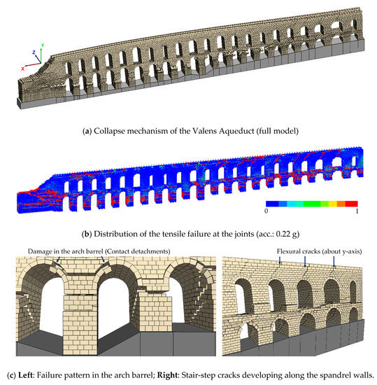 The global structural behavior of the aqueduct is shown in Figure 9a,b, where the overall deformation and damage regarding joint openings are displayed. The results illustrate the development of contact opening not only in the piers, but also at the side-wall adjacent to the first pier (P-1 in Figure 8a,b). In Figure 9b, the tensile failures at the joints and overturning collapse mechanism of the wall can be seen. It is worth noting that the contact opening is represented via a scalar damage parameter (from 0 to 1), in which the full joint opening yields one, whereas zero means that there is no contact opening. Furthermore, substantial contact detachments were detected at the arches along with flexural cracks at the upper part of the spandrel (about the vertical axis) when the aqueduct started to collapse (Figure 9c).