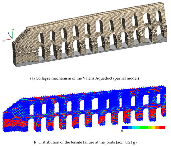 Furthermore, the collapse mechanism observed in the numerical model and the original experiment were nearly identical, as presented in Figure 5. Both the in-plane and out-of-plane mechanisms that were simulated in the discrete element model were compatible with those of the experiment, where the diagonal shear cracks in the longitudinal walls and overturning mechanism of the transverse walls were captured (see Figure 5). Therefore, the proposed modeling strategy was deemed capable of simulating the expected damage patterns in a masonry structure along with the accurate prediction of its ultimate capacity. As the crack pattern and the structure’s global response were captured accurately via the proposed modeling approach, the validation can be considered acceptable, even though the material properties and structural configurations of the Valens Aqueduct are different from those of the benchmark study. This validation strategy has been proven to be a valuable tool, especially when destructive testing of historical structures is not allowed. In the next section, the same modeling approach is utilized to analyze the Valens Aqueduct.