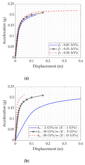 First, the tensile strength was varied from a negligible strength (i.e., 0.05 MPa) to a higher value used for similar structures, representing “good condition” in the bond between the units and mortar, such as 0.5 MPa. The results clearly indicate that when the tensile strength was within the prescribed interval, there was no considerable change in the seismic force capacity, as shown in Figure 11a. In contrast, the deformation capacity increased significantly. On the other hand, a quite sensitive response to the acceleration was obtained for the contact stiffness, ranging from 2 to 30 GPa/m, which was directly calculated based on the stiffness of the masonry. The results indicated that the stiffness of the aqueduct had a pronounced effect on the behavior and deformation such that the lowest contact stiffness decreased the seismic capacity to 0.19 g with a significant deformation, whereas for higher contact stiffnesses, the capacity converged to 0.21 g with very limited deformation capacity (see Figure 11b).