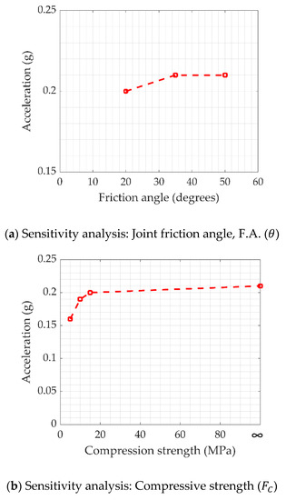 Figure 12a,b shows the influence of the joint friction angle and compressive strength on the seismic capacity. The results suggest that the numerical model was less sensitive to the friction coefficient compared to compressive strength, as defined at the joints. It is important to note that the compressive strength of the stone units may vary from 5 to 130 MPa for low- and high-quality limestone [48]. However, special attention should be paid because the analyses performed here did not take into account the dynamic (or cyclic) behavior of the structure, where a friction coefficient may become more influential. Additionally, the critical value for the compressive strength seemed to be 20 MPa, after which the compression capacity did not influence the failure mechanism, but the structure failed due to the lack of tensile strength (Figure 12b). In addition, the seismic capacity only increased by 5% when the compressive strength of the masonry was higher than 20 MPa.