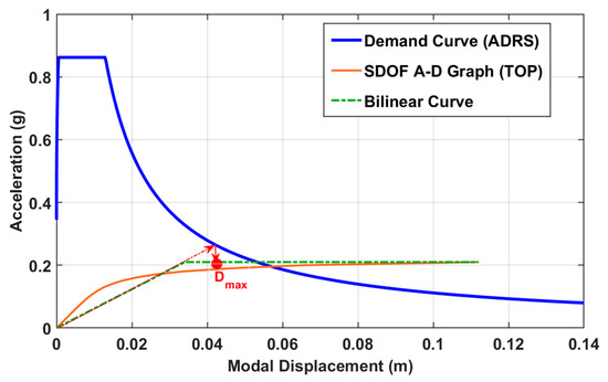 In this study, the aqueduct’s mass was discretized into eight nodes along the height of the pier that showed the maximum displacements in the pushover analysis. The displacement vector, Φ, was determined from the lateral displacements of the discretized mass nodes. The modal participation factor and the acceleration–displacement response of the equivalent SDOF system were calculated according to the information provided above. The elastic demand spectrum was determined using the information provided in the Turkish Building Seismic Code [50]. The elastic design spectrum was generated first by using the structure’s coordinates and setting the local soil conditions as ZB, representing a soil profile with a ground shear wave velocity between 760 and 1500 m/s. The intensity of seismic ground motion was chosen as DD-2, representing a 10% probability of exceedance in 50 years (or a 475 year return period). The acceleration–displacement response of the SDOF system was bi-linearized using the procedure defined in EN 1998-1 [51]. The elastic demand spectrum and the bi-linearized SDOF curve were used to obtain the performance point in the modal domain, as illustrated in Figure 13. The performance point, Dmax, that showed the maximum modal displacement as 4.1 cm was then transformed back into the physical space to determine how much displacement a particular node would undergo during the design-level earthquake. The top discretized node’s displacement was found to be 6.19 cm.