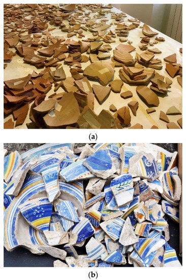 The Roman amphorae (a) and Majolica of Montelupo Fiorentino (b) are two of the main test classes used to train the system, for their peculiar characteristics useful to stress the algorithms for shape-based, and appearance recognition, respectively. Thanks to the collaborations of different institutions, museums, research groups, and colleagues worldwide, it was possible to collect photos of thousands of sherds. In this figure, part of the sherds were from the Roman site of Spoletino (Viterbo-Italy), and fragments stored in the Museum of Ceramic in Montelupo Fiorentino warehouse.