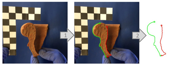 The automated extraction of the outer (green) and inner (red) profiles from a real-world sherd image.