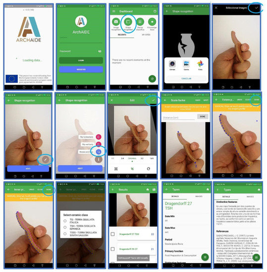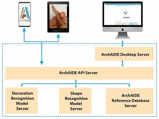 Mobile and desktop applications were developed to make ArchAIDE fully operational. Their functionality was designed taking into account the workflow of pottery analysis, from the finding in the field to post-excavation examination, considering the environmental context in which these activities are performed (warehouse, remote places, etc.) and the related constraints. Through continuous feedback from the archaeological companies involved in the consortium and external associates who collaborated with the project [63], it was possible to collect suggestions on automating this workflow, improving the design, and generating new prototypes. In the end, various needs have been taken into consideration, from the use as a recognition tool, to collecting and storing data in the form of digital assemblages. The design prioritised intuitive access and ease of use (Figure 10). The final result is a digital ecosystem in which mobile and server-side applications interact through an API server mediating all the communications and activities.