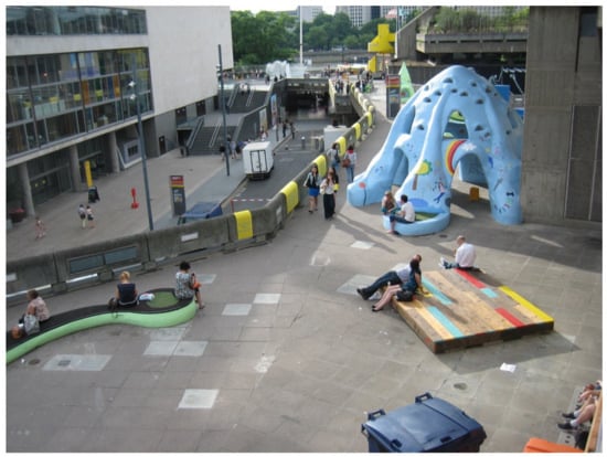 The Queen’s Walk riverfront and Southbank square, as a retrofitted and new public space, respectively, benefited from great improvements after the first regeneration project and both now feel part of the public realm. Both of them are generally better used than they were before, catering to a good range of uses, but they unfortunately are not yet used to their full potential. Although the regeneration design interventions have successfully reclaimed these public spaces, they have not been able to activate them enough. In both spaces, design interventions have been quite prescriptive and regulatory. This is visible in their introduction of a limited diversity of uses, and their focus and reliance on commerce, which seems to undermine other uses. In doing so, the new redesigned spaces offer a great contrast to the original spaces, as they lack the open qualities of the original design. However, despite their limitations, at least the new design interventions show that these spaces can be retrofitted, therefore challenging ongoing critiques that they are “challenging to adapt” [50].