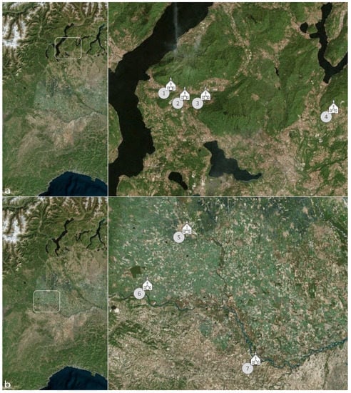 Localization of the sites in Lombardy (a) and in Piedmont (b).