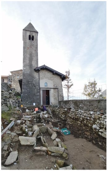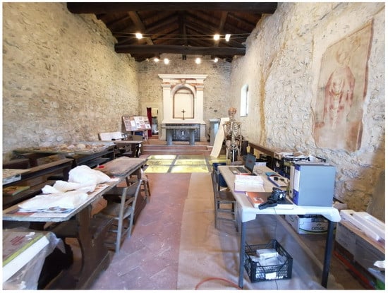 Currently, it is possible to visit the cemetery area discovered in 2002—the Romanesque church with its splendid frescoes, the laboratory of physical anthropology with the osteoarchaeological remains and the archaeological excavation adjacent to the external area. Among the already planned works that are in progress for the Caravate site are the completion of the archaeological investigation, the study of the osteoarchaeological finds in the excavation area and the musealization of the entire site with the creation of posters describing the history of the site (Figure 2).