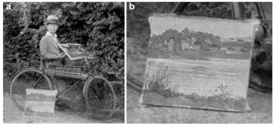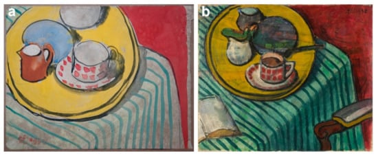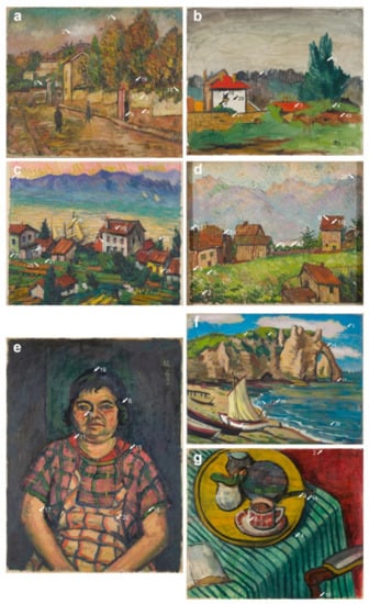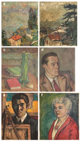 The discussion focuses on seven paintings from the National Gallery Singapore (NGS) and six paintings from the Liu Kang Family Collection (Figure 1 and Figure 2). The inclusion of the paintings from the Liu collection ensured that the overall research base represents a range of the artist’s genres and painting technique during the period from 1929 to 1932. It needs to be noted that the Paris phase also includes artworks he painted during a trip to Saint Gingolph on the French–Swiss border between 8 August and 20 September 1929 []. The painting supports of the investigated artworks are not in the scope of this research as a comprehensive study of the supports was carried out earlier [].