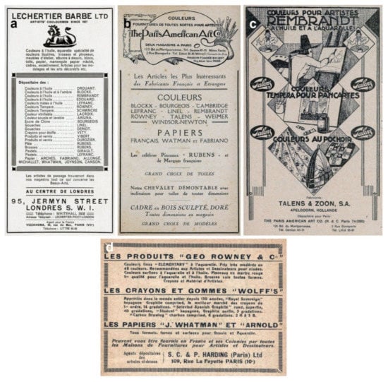 Advertisements by official retailers of local and overseas art materials, available in Paris in 1930 and 1932: (a) Lechertier Barbe LTD; (b) Paris American Art Co.; (c) Talens and Zoon, S.A. advertisement indicating Paris American Art Co. as its Paris representative; and (d) S. C. & P. Harding (Paris) LTD.