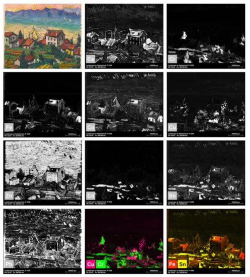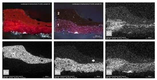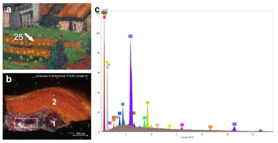 The sample 35 from Landscape in Switzerland contains two distinguishable layers. Based on the PLM, SEM-EDS, and FTIR, the top red is composed mainly of red iron oxide with an admixture of Sn-containing organic red, detected by absorption peaks at 1620, 1563, 1555, 1529, 1471, 1290, 1265, 1246, and 588 cm−1, and chalk. This top layer was applied over dry paint predominantly consisting of the organic red, detected by peaks at 1621, 1562, 1552, 1531, 1310, 1265, 1247, and 604 cm−1. In addition, a presence of starch was confirmed with PLM observation and FTIR by absorption peaks at 3294, 1639, 1370, 1341, 1247, 1204, 1150, 1077, 1016, 931, 861, 759, and 704 cm−1, while Sn-based substrate was confirmed with the SEM-EDS. Moreover, the analysed paint contains some admixtures of lead white and probably Cr-containing yellow(s) (Figure 10). The MA-XRF map of Sn distribution in Landscape in Switzerland shows that some passages were initially painted with a heavy use of Sn-containing organic red (Figure 4) and finally covered with different colours as visualised on the cross-section of sample 25 (Figure 11).