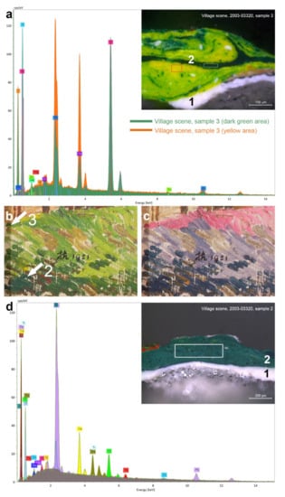 The analyses of the light and warm green hues of the investigated paintings confirmed a consistent use of chrome yellow (lead chromate) as an admixture of viridian. This can be exemplified by sample 3 from Village scene (Figure 5a). In this sample, besides viridian, chrome yellow was detected with PLM by anisotropic, rod-shaped particles with a high refractive index. The SEM-EDS analyses of the green and yellow clusters of not properly mixed paint indicated a varied intensity of Pb-, Ca-, and Cr-peaks contributing to viridian and chrome yellow, probably extended with chalk (calcium carbonate) or calcium chromate []. The presence of viridian in the examined paint is in agreement with the purple imaging of the sampling area (Figure 5b,c).