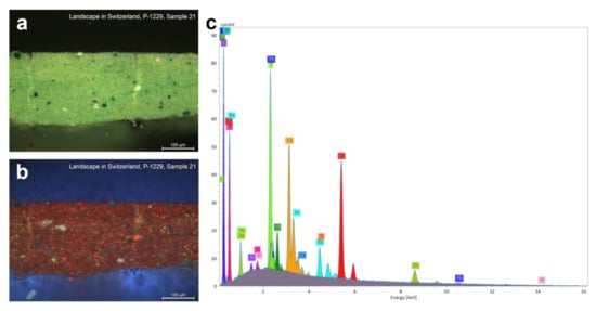 Microscopy images of the cross-section of sample 21, extracted from Landscape in Switzerland, photographed in: (a) VIS; (b) UV. The corresponding SEM-EDS spectra of the green paint are seen in (c). Red fluorescence of yellow particles and a strong Cd-signal suggested the presence of cadmium yellow.