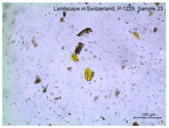 The organic red was also observed with PLM in the sample extracted from Countryside in France (sample 7). The sample does not fluoresce in UV, and the SEM-EDS detection of Al might be indicative of Al-containing substrate for the organic red detected with FTIR by peaks at 1617, 1576, 1559, 1506, 1499, 1447, 1417, 1397, 1343, 1303, 1276, and 1256 cm−1 []. However, the insufficient suit of FTIR peaks or low intensity of peaks did not allow a conclusive attribution.