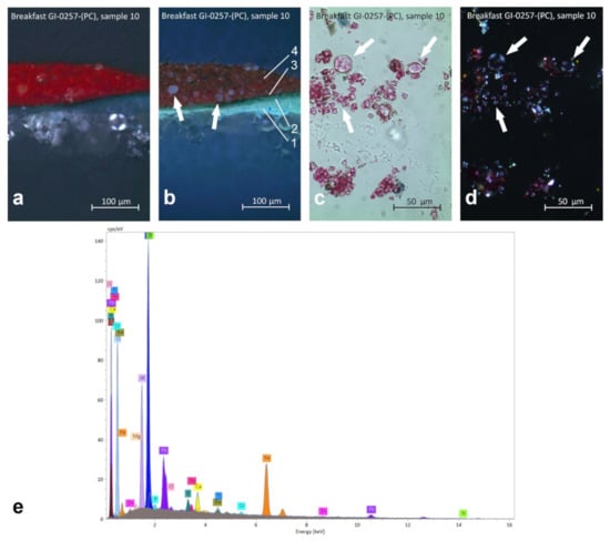 Microscopy images of the cross-section of sample 10, extracted from Breakfast, photographed in: (a) VIS; (b) UV. Circular, blue-fluorescing particles of the starch substrate are visible in layer 4 and marked with arrows (b). The PLM pigment dispersion from layer 4 is photographed in: (c) plane-polarised light; (d) cross-polarised light. The clumps of starch particles are marked with arrows. The corresponding SEM-EDS spectra of the red paint from layer 4 (e) shows a strong Sn-signal, suggesting the presence of tin substrate.
