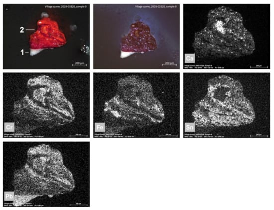 The FTIR of sample 9 from the Village scene showed low intensity peaks at 1562 and 1545 cm−1, which are indicative of organic red; however, an in-depth molecular characterisation was not possible due to overlapping signals of other compounds present in the investigated sample. A similar issue concerns the identification of starch. Although starch was well observed with PLM, only two FTIR peaks, at 3280 and 1649 cm−1, were considered conclusive. Additionally, detection of Fe and co-location of Pb-, Cr-, and Ca-signals, suggested that an organic red was used in a combination with red iron oxide (absorption peaks at 1026, 1007, 935, 911, 798, 777, and 753 cm−1), chrome yellow (absorption peaks at 1031, 844, 834, and 624 cm−1), chalk (absorption peaks at 1410, 870, and 712 cm−1), and probably lead white (1410 and 677 cm−1) (Figure 9).