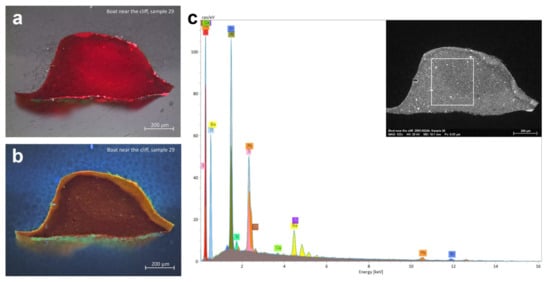 Microscopy image of the cross-section of sample 29 extracted from Boat near the cliff photographed in: (a) VIS; (b) UV. SEM-EDS spectra of the sample and inset backscattered electron (BSE) image with marked area of analyses (c). The spectra shows Br peaks which could be indicative of geranium lake, as well as Pb, Ba, Al, and S, which can be assigned to lead white and barium white extender and/or Pb- or Al-based substrate.