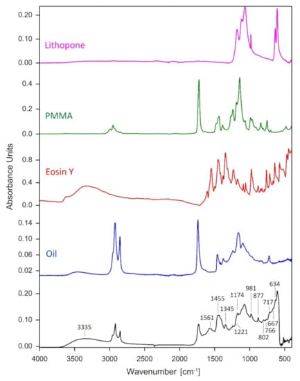 Another organic red was detected in Boat near the cliff (sample 29). PLM allowed the observation of red particles with a low refractive index, which is characteristic of organic reds. An intense orange fluorescence in UV light (Figure 12b) suggests natural madder []; however, the SEM-EDS detection of bromine, based on Br Lα1 and Br Kα1 signals (Figure 12c), indicates that the red may be a compound related to eosin red—commercially known as geranium lake—which is also characterised by the orange UV fluorescence [,,]. A comparison of the FTIR spectra of the investigated red with the reference sample of eosin Y revealed some degree of matching. Typical FTIR features consistent with the organic red were identified by absorption bands at 3335, 1561, 1455, 1345, 1221, 1174, 981, 877, 802, 766, 717, 667, and 634 cm−1. However, the overlapping bands at 1455, 1174, 981, 802, 717, and 634 are also attributable to lithopone and/or barium white, oil, and acrylic resin, the latter of which is considered to be a varnish and applied during the conservation treatments in 2006 (Figure 13) []. Other elements present in the sample, such as Pb, Ba, Al, and S, were difficult to interpret. They can be assigned to lead white admixture and barium white extender. However, it is known that eosin was used to produce lake pigments (such as geranium lake), usually precipitated on an Al- or Pb-containing substrate [,,,,]. Thus, Ba and S could be assigned to barium white, which is a common extender of lake pigments. Nevertheless, a presence of lithopone is suggested based on the FTIR detection of characteristic peaks at 1174, 1116, 1077, 981, 634, and 607 cm−1.