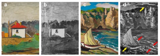 VIS and corresponding UVR detail images of (a,b) Countryside in France; (c,d) Boat near the cliff. The UVR images indicate that white house in Countryside in France and foamed water in Boat near the cliff (marked with red arrows) show a strong UV reflectance attributable to lead white. White brushstrokes on the boat and clouds in Boat near the cliff appear dark grey and black in UVR (marked with yellow arrows), suggesting a use of UV absorbent zinc white, later confirmed with SEM-EDS.
