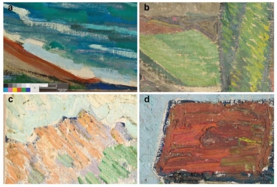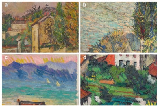 The next step of the painting process involved a gradual colouring in of the outlines of the forms, providing the base for further work, as seen in Countryside in France and Landscape (Figure 1b and Figure 2b). This method, known as ébauche (coloured sketch), was a common practice among Impressionists []. Analyses of the brushstrokes revealed that the middle-ground buildings of Countryside in France and the foreground house and a tree of Landscape were painted first. Then, the artist continued building the colouristic structure around these main subjects. The sky in Countryside in France was probably sketched at the end, after the background greenery was completed. Both sketches were conducted in local, vivid colours. A minimal suggestion of light effects observed in the sky of Countryside in France was achieved by the increased transparency of the colour, allowing the white ground to show through. The rapid development of the composition during the initial painting phase was facilitated by a few factors observed in Countryside in France. The small size of the painting support (number 10) reduced the time required to cover the surface with colours. The use of the absorbent or semi-absorbent ground with the ability to draw the oil from the paint accelerated the drying of the paint layer [,]. A thin application of colours mixed with lead white promoted the rapid drying of the paint layer. The presence of the signatures and dates indicates that the artist envisaged the coloured sketches as a completed exercise.