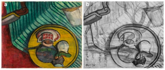 It is noteworthy that the VIS and NIR photography of the paintings did not detect the presence of the preparatory underdrawings. However, Liu Kang probably studied the subject matter by small-scale sketching prior to painting the composition on the canvas. For instance, a watercolour sketch of Breakfast from the Liu collection reveals an early idea of the composition for the canvas painting Breakfast, which was executed in the same year (Figure 15). Technical evidence from the Countryside in France, Village scene, Breakfast, and Self-portrait indicated that the artist approached the canvas with a clear concept of the general composition, which was established with rough brushstrokes usually of a black paint (Figure 1b,d,g and Figure 2e).