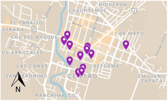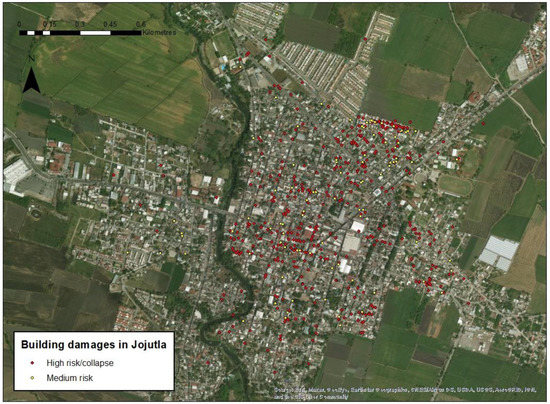 Figure 4, displaying areas with high and medium risk to its buildings. The high risk includes the collapse of the structures, since Jojutla experienced major material and human losses. Two colonies of the city were specially affected: the historic center, where most of the adobe dwellings and monuments were located; and the Emiliano Zapata colony, much more recently built with the majority of its constructions consisting of concrete structures.