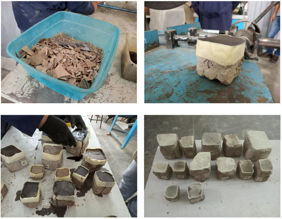 In order to perform the mechanical tests of the samples and some non-destructive trials, these had to be prepared. First, all the material was dried for one to two weeks in the oven at a maximum temperature of 50–60 °C; a higher temperature could change composition of the clay materials. The samples were weighed every day until they presented a constant weight, then, they were left cooling for 24 h.