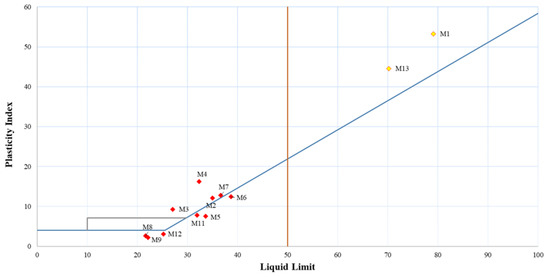 59], and using the CLRM-200 colorimeter equipment, the adobe samples were measured, obtaining three parameters: the coordinates a* and b* (red to green and yellow to blue axis), and the luminosity L*.