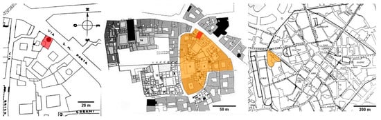 The location of the site of Santa Maria alla Porta (Milan, Italy). The investigated site and the Palatium are marked in red and orange colour, respectively. The map is shown at different levels of magnification (see scale bars) to help to situate the site in the Roman city structure.