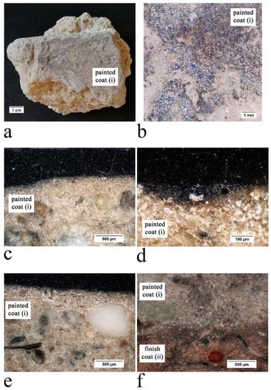 (a) Painted surface of the sample and (b) digital microscope image of the painted surface: a mixture of blue and black particles can be seen; (c–e) optical microscope image of layer (i) (polished cross section); (f) optical microscope image of layer (ii) and layer (i) (polished cross section).