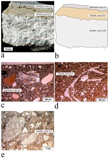(a,b) A sample from the site of Santa Maria alla Porta, showing the sequence of the plaster coats: (i) painted (top, thin); (ii) finish (middle); (iii) render (bottom, thick). (c) Thin cross sections of the painted coat (i) with clay mud and coarse clasts. (d) Finish coat (ii) with clay mud and linear cavities. (e) Render coat (iii) with lime and lithic clasts (optical microscopy plane-polarised light).