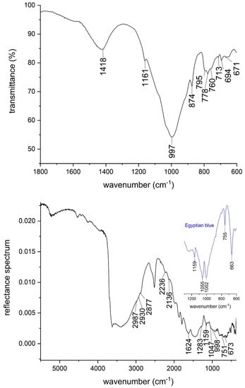 ATR spectrum (top) of the painted layer, showing the presence of Egyptian blue (1161, 997, 760 and 671 cm−1), calcite (1418, 874 and 713 cm−1) and quartz (795, 778 and 694cm−1); FTIR-ER spectrum (bottom) of the painted coat, with the most interesting peaks. Peaks of Egyptian blue (1159, 1047, 998, 751, 673 cm−1—see also an excerpt of FTIR-ER spectrum of Kremer 10060 Egyptian blue standard pigment), gypsum (2136, 2236 cm−1) and organic substance (2987, 2939, 2877 cm−1) were shown.