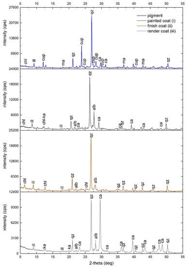 Some of the signals observed in the FTIR spectrum are those already observed in the painted coat, which are the peaks already attributed to calcium carbonate (1408, 872 and 712 cm−1) and to quartz (797, 778 and 694 cm−1), which make up the mortar. There are peaks at 3694, 3651, 3627 and 3618 cm−1 (stretching of outer and inner hydroxyl ions), and 1084 and 1017 cm−1 (Si–O stretching bands of quartz and kaolinite). These peaks are probably related to clay minerals, such as illite [26]. XRD analysis on powders revealed the presence of quartz, illite, albite and chlorite (Figure 6).