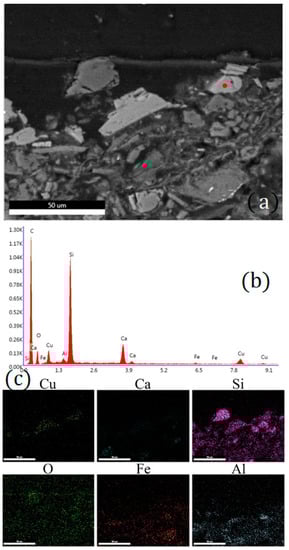 (a) SEM image in BSE mode of the painted layer; (b) EDX spectrum of a particle of Egyptian blue; (c) EDX elemental distribution maps (scale bar: 50 µm).